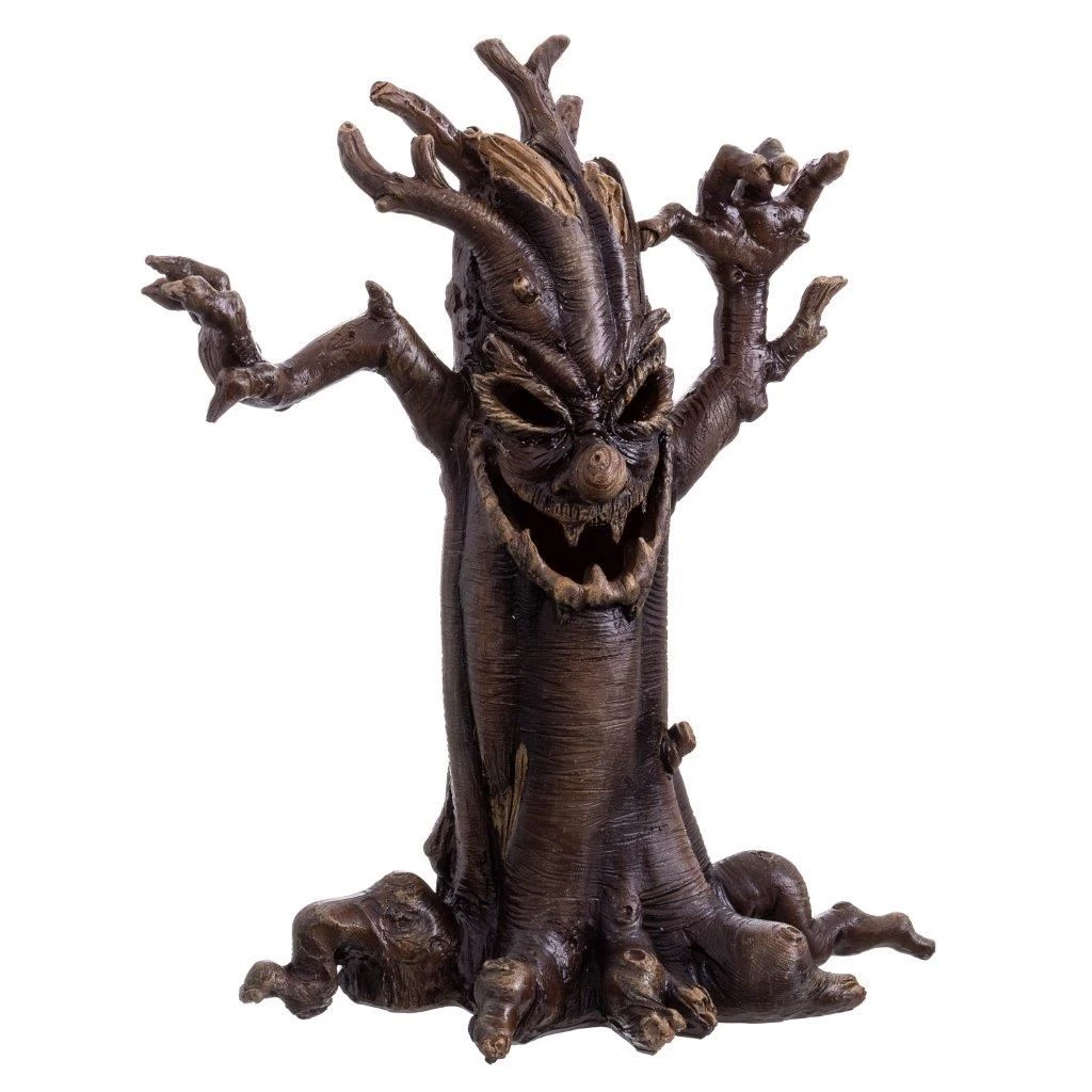 Decorado de Halloween con forma de un siniestro árbol. Hecho en poliresina de excelente calidad. Tiene una luz en su interior que parpadea cambiando de color e ilumina su rostro de manera siniestra. Mide aprox. 23x13x28cm. Ideal para decorar en bares, restaurantes, tiendas, fiestas y Halloween.