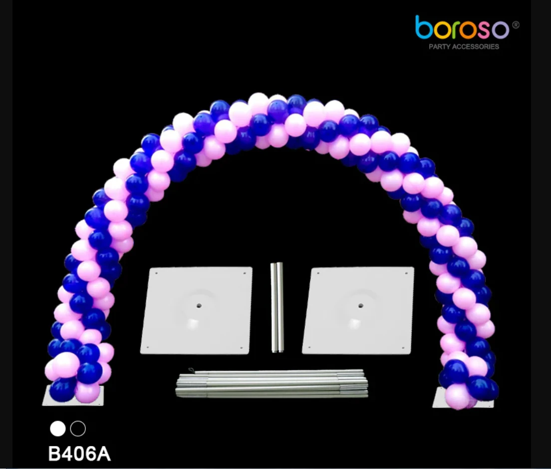 Arco para hacer una decoración de globos grande. Material de metal las bases y la estructura es de un plástico rígido, como pvc. Muy resistente El arco mide 3m x 2.5m y sus bases de metal 40x40cm. El peso de las bases es de 4.5kg cada una. No incluye globos.