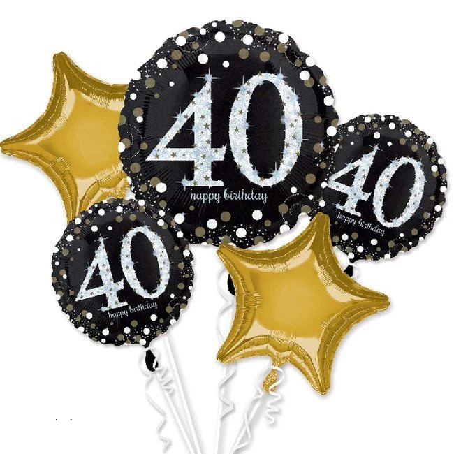 Bouquet de globos para un 40 cumpleaños o aniversario. Se compone de: – 1 globo Jumbo círculo holográfico de 71cm – 2 globos círculos holográficos de 45cm – 2 globos estrellas doradas de 48cm Se envían sin inflar, sin cinta y sin pesos