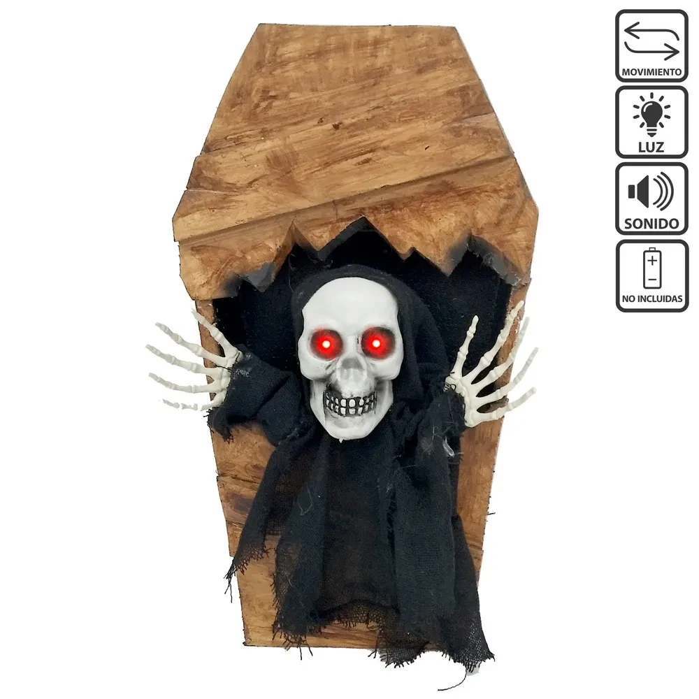 Ataúd Esqueleto. Un Detalle Espeluznante para tu Decoración de Halloween. Prepárate para darle un toque auténticamente aterrador a tu decoración de Halloween con este increíble ataúd esqueleto. Con unas dimensiones de 41 x 27 x 17 cm, este ataúd esqueleto en tonos marrón y negro está diseñado para sorprender a tus invitados. Lo más aterrador es que este ataúd esqueleto no es solo una pieza decorativa, sino que también cuenta con luces, sonidos y movimiento, lo que lo convierte en una verdadera atracción en tu fiesta de Halloween, lleva 3 pilas AA, no incluidas.