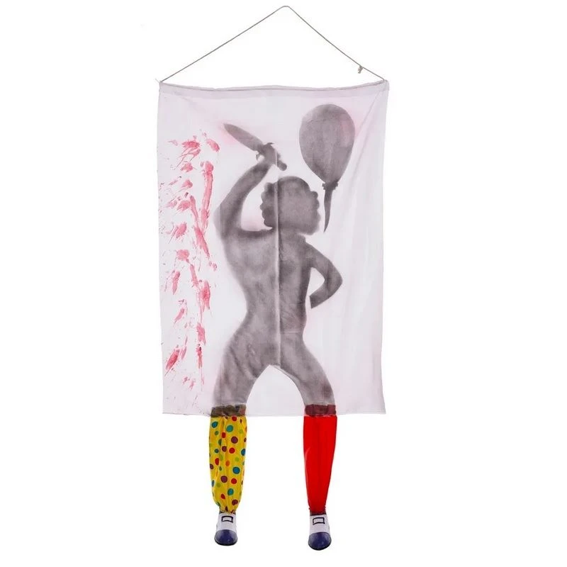 Decorado de Halloween con forma de un Payaso Asesino escondiéndose detrás de la cortina. Es una cortina con la silueta del payaso. Debajo tiene unas piernas de payaso con los zapatones respectivos. Ideal para decorar las Fiestas de Halloween. Mide aprox. 100cmx28cmx185cm.