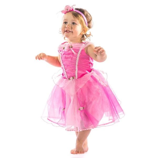 Precioso disfraz para bebes de la princesa Disney Bella Durmiente con falda de tul y manga corta y rosa, inspirado en el vestido que usa en el baile en color rosa, incluye una cinta para el pelo a juego con el vestido. Talla 12 a 18 meses.