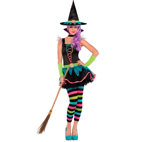 Divertido disfraz de bruja con unos colores vivos y con una calidad excepcional. El disfraz incluye un vestido corto con falda tipo tutu, viene en color negro con adornos en colores fluor, sombrero de bruja, cuello, muñequeras y leggings a rayas.