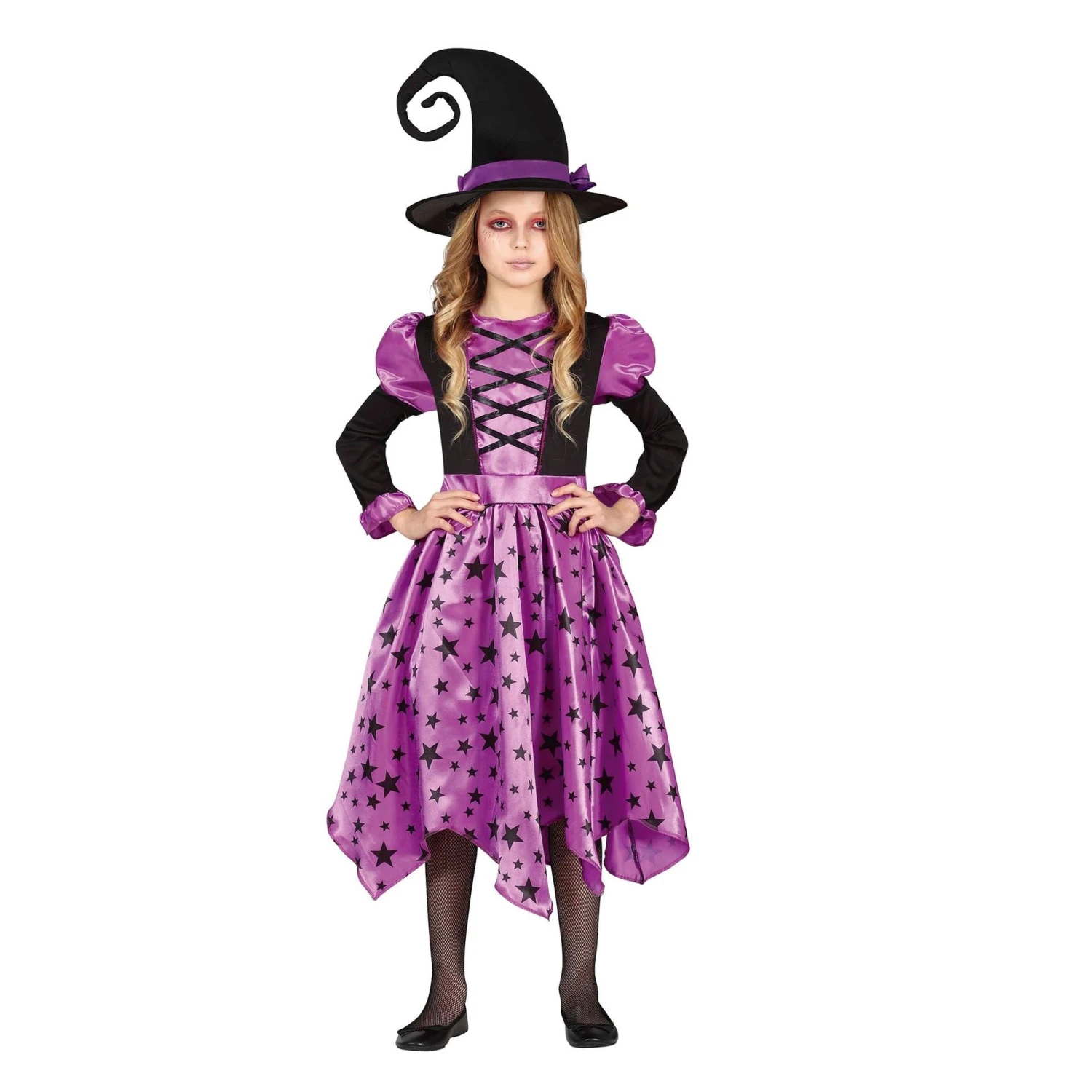 Disfraz de bruja en tonos púrpuras. Incluye sombrero y vestido. Talla 3-4 años. Ideal para Halloween.