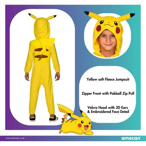 Disfraz de Pokémon Pikachu, de la serie de dibujos Pokémon. Disfraz que contiene un mono con capucha de tacto suave. 100% poliéster. Para peques de talla 3-4 años. Medida aprox 98cm a 104cm. LICENCIA OFICIAL Si quieres la fiesta completa, también disponible la vajilla junto con los globos.