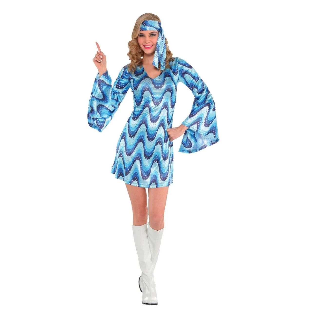 Disfraz de mujer de Disco, Años 70. Incluye Vestido y Pañuelo. Talla 38-40. Perfecto para Carnaval o fiestas de disfraces.