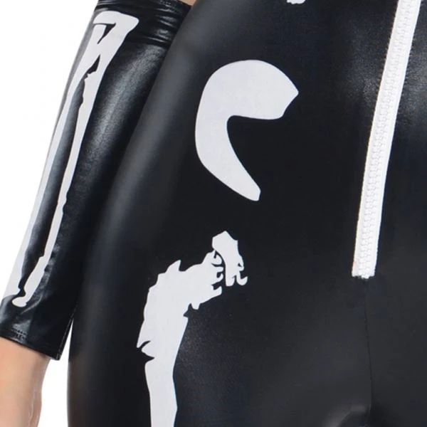 El disfraz de Halloween para las más atrevidas. Incluye un espectacular mono de cuero falso negro con todo el esqueleto humano ilustrado en blanco. y unas muñequeras largas para los brazos. ¡Atrevido y bonito! Medidas en descripción general.