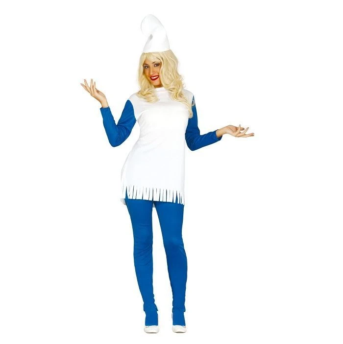 Disfraz de Pitufo, en este caso de nuestra linda pitufina. Incluye gorro, camiseta y pantalón. No incluye peluca rubia ni zapatos. Talla L- Equivale 38-40. Medida pecho 93-96cm aprox.