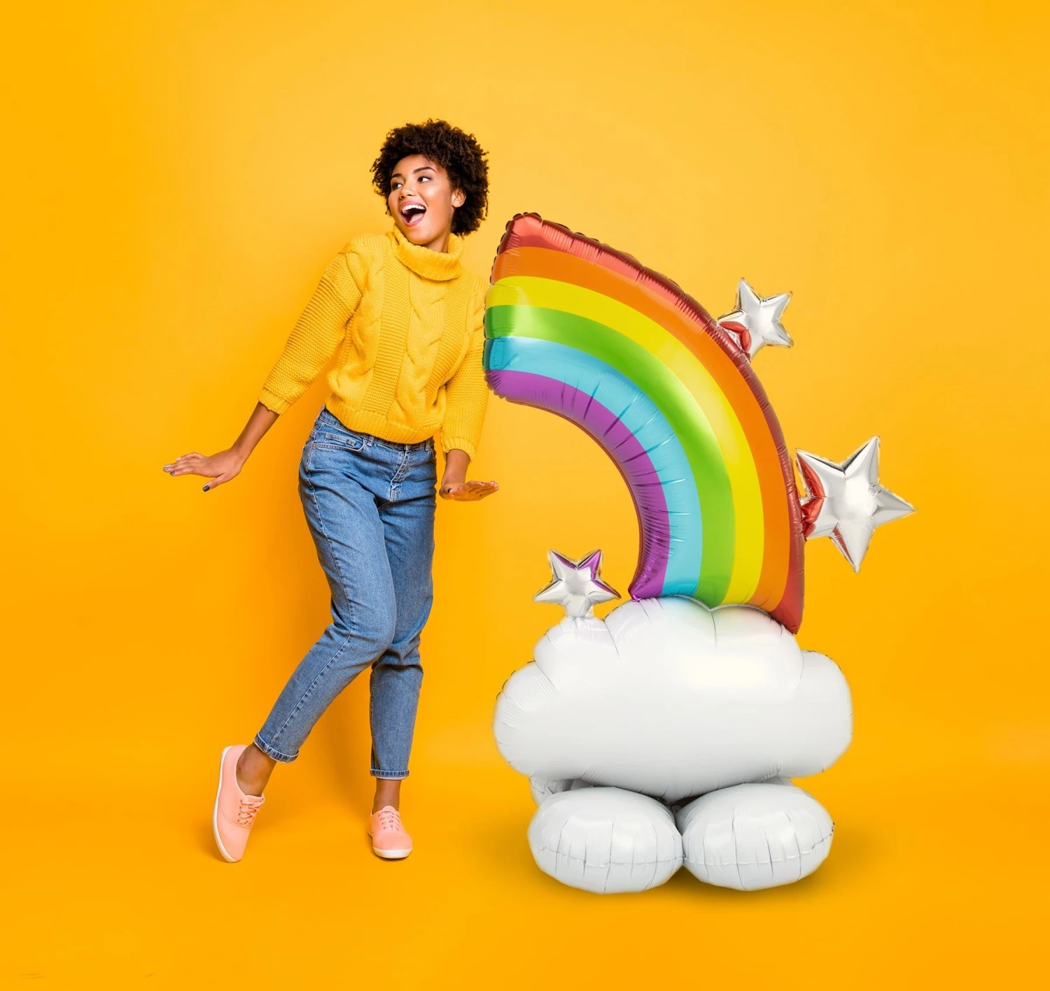 Globo de foil Airloonz espectacular con forma de arcoiris. Muy llamativo y duradero, es ideal para decoraciones de fiestas arcoiris. Viene sin inflar. Su diseño le permite estar de pie una vez lleno. Se infla con aire, no es necesario helio. Mide aprox. 132cm de altura por 91cm de ancho. Dentro del globo vienen las instrucciones de montaje. Se puede utilizar una pajita para inflarlo.