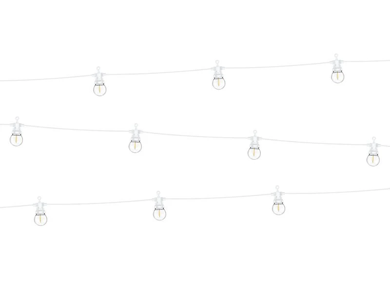 Tira de luces de led de alta calidad de color blanco con forma de las tradicionales bombillas. Son perfectas para iluminar bodas, comuniones, fiestas de jardín, terrazas o incluso en casa. Esta guirnalda se puede usar en exterior y si compras varias puedes unir una con otra, vienen preparadas para ello. Son aptas para interior y/o exterior, miden aprox 5m, con un cable adicional de 3m. Color de la luz, amarillo cálido. Contiene 10 bombillas. Entre bombilla y bombilla hay una separación de 50cm. Se enchufa directamente a la red 220v