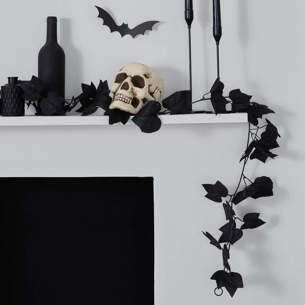Guirnalda de Hiedra artificial de color negro para darle un toque de Glamour macabro a las decoraciones en Halloween o fiestas de disfraces. La guirnalda Mide aprox 1.8 metros.